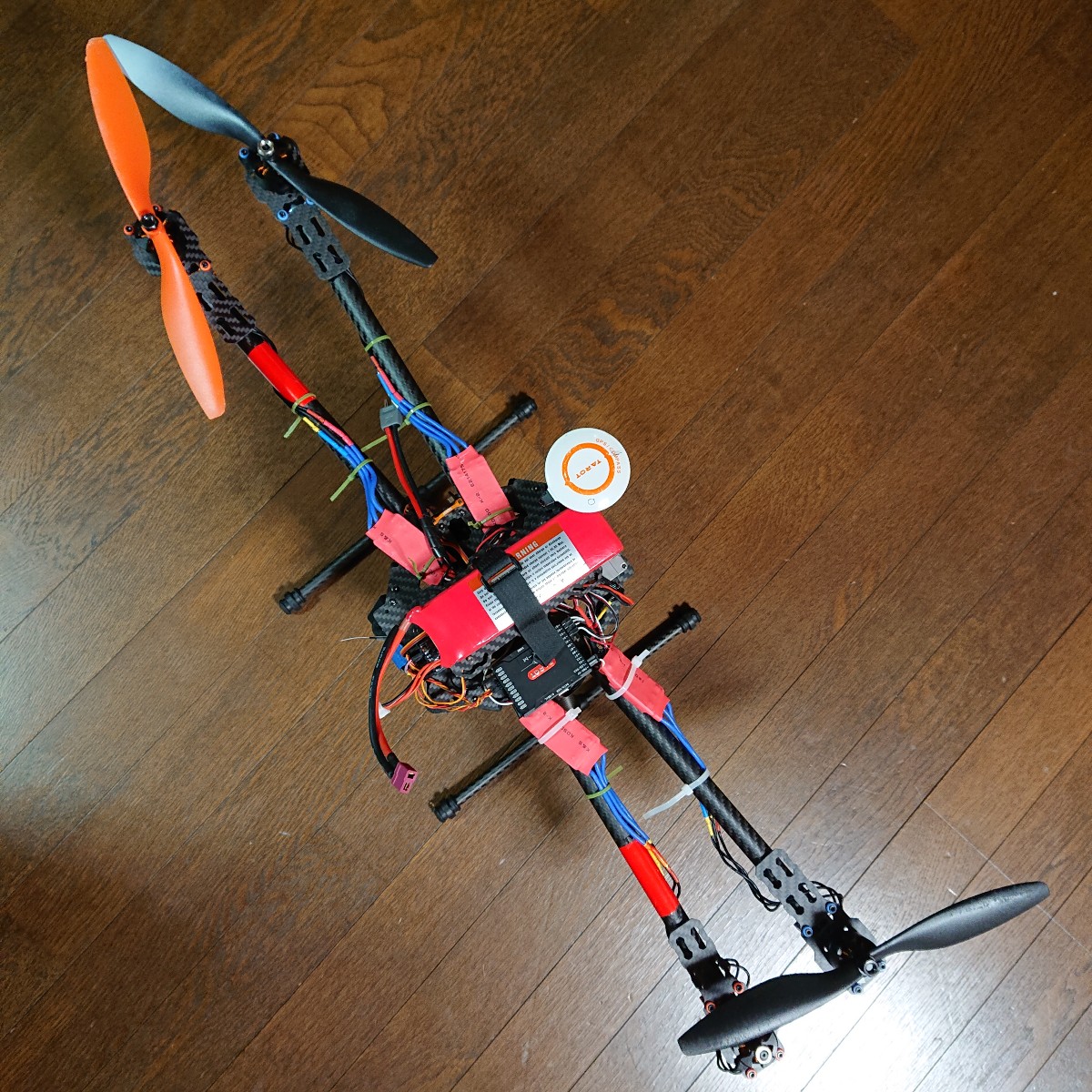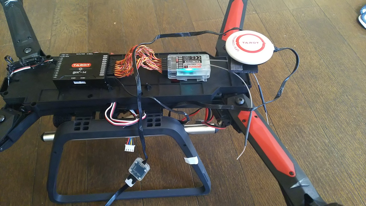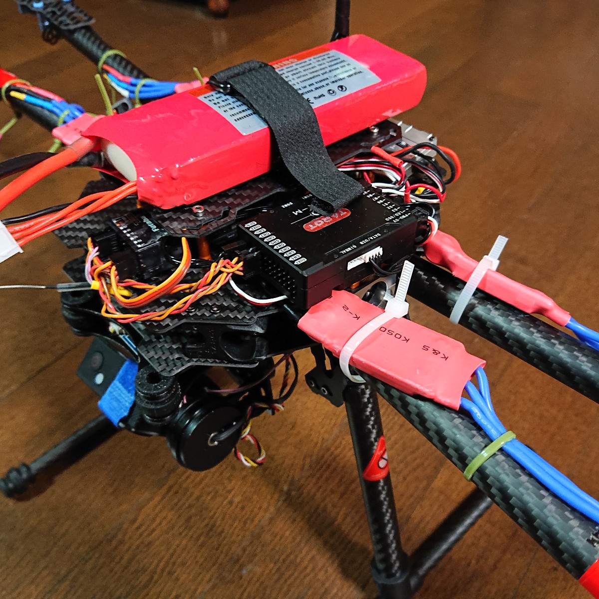 | FCは、左側にオフセットして搭載(折りたためる構造ですが、スキッドも手動です。) | 機体が大きくなったので、ゲインの設定をし直す。 |