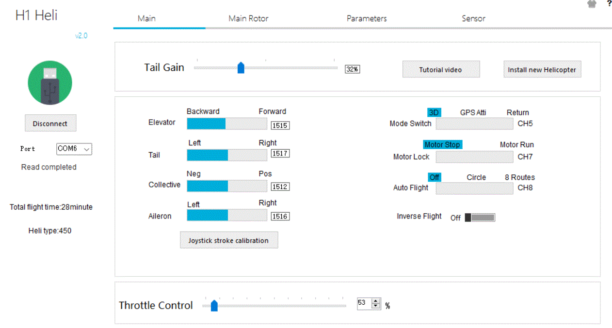 以下は、機体の設定が済んでる場合の設定で、初めて搭載する場合は、上図の「install new Helicopter」をクリックし機体設定を行います。