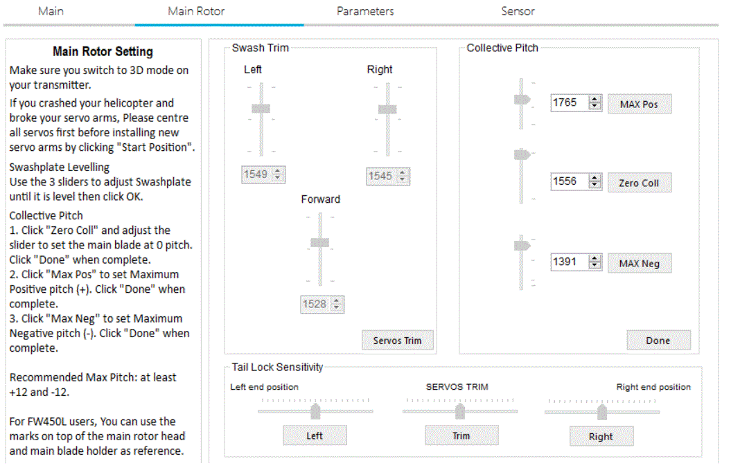 図右の「コレクティブピッチ」設定では、+12度(位)、0ピッチ、-12度(位)の位置を調整します(3サーボ同時に動きます)